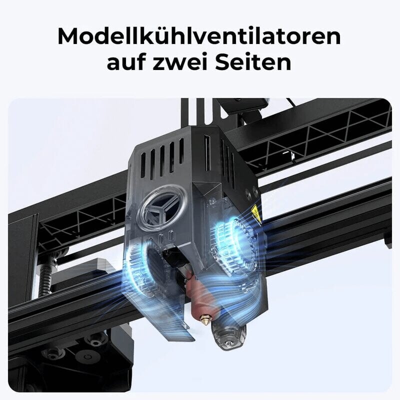 De x-as met lineaire rails zorgen voor soepele bewegingen en betere precisie. De koelingsventilatoren aan twee kanten zorgen voor een supersnelle koeling. Hierdoor zullen de zojuist geprinte delen snel afkoelen, wat zorgt voor een strakke print.