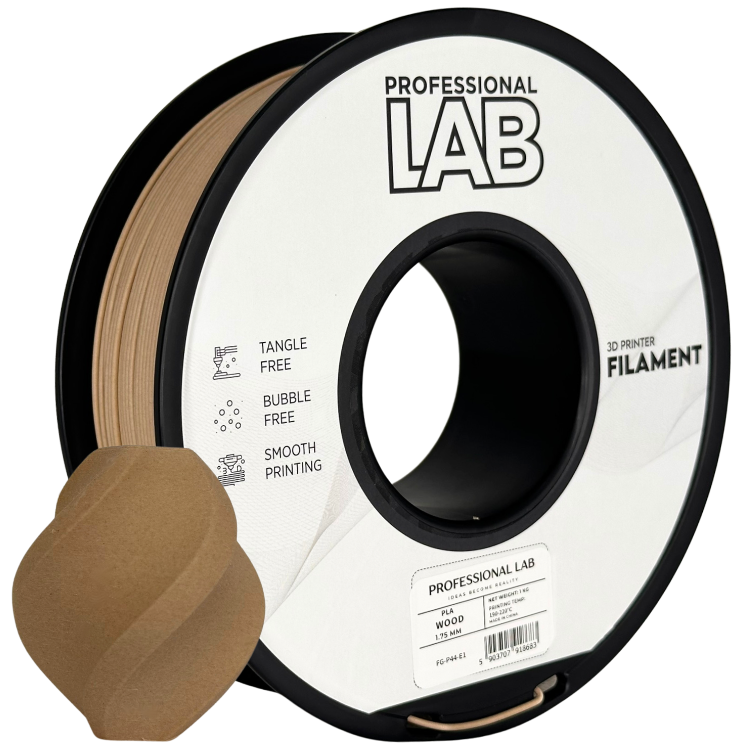 PLA Wood is een composietfilament gemaakt van PLA gemengd met fijne houtvezels. Het heeft een houtachtige uitstraling, geur en textuur. Ideaal voor artistieke, decoratieve of prototypemodellen. Een grotere nozzle (>= 0,5 mm) wordt aanbevolen om verstopping te voorkomen